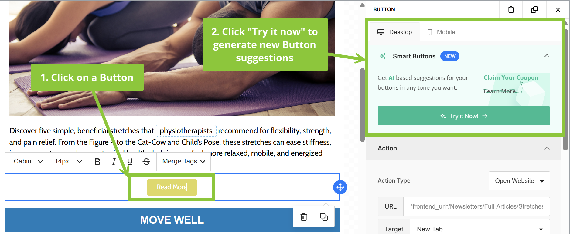 - At the top of the Button options, in the “Smart Buttons” section, click “Try it now” to generate new Button suggestions