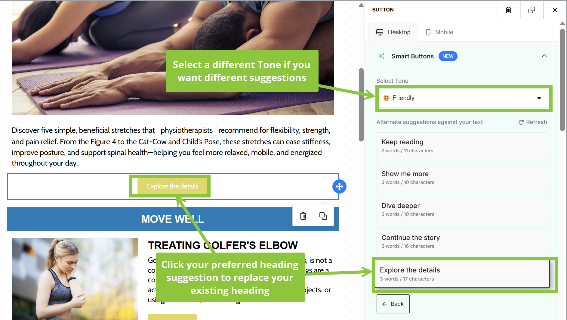 - You will be given 5 AI-generated button suggestions. You can select your preferred tone to generate new suggestions (friendly, luxury, relaxed, professional, bold, witty)