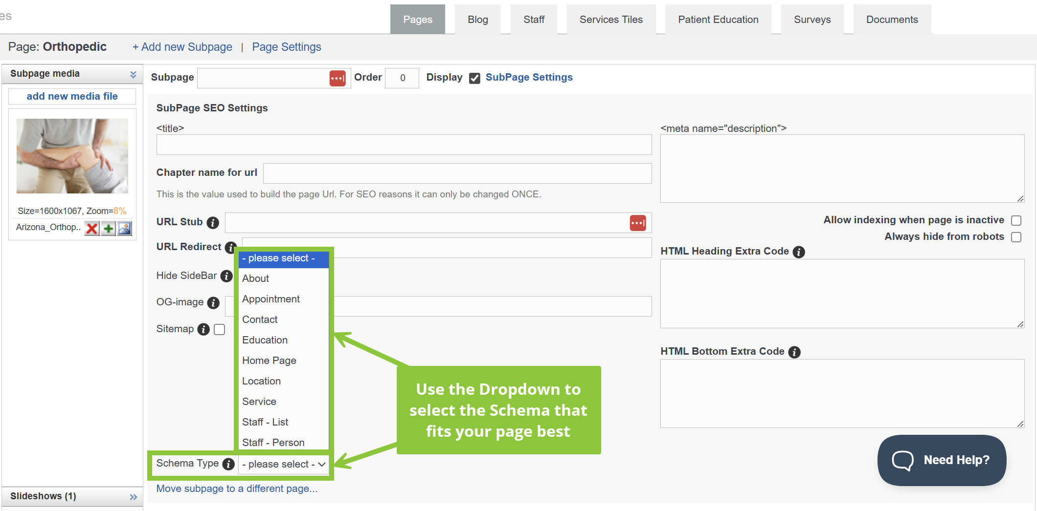 5) Use the dropdown next to Schema Type to select the schema that best matches the page (for example, if you’re working on a Service page, select the “Service” schema type)